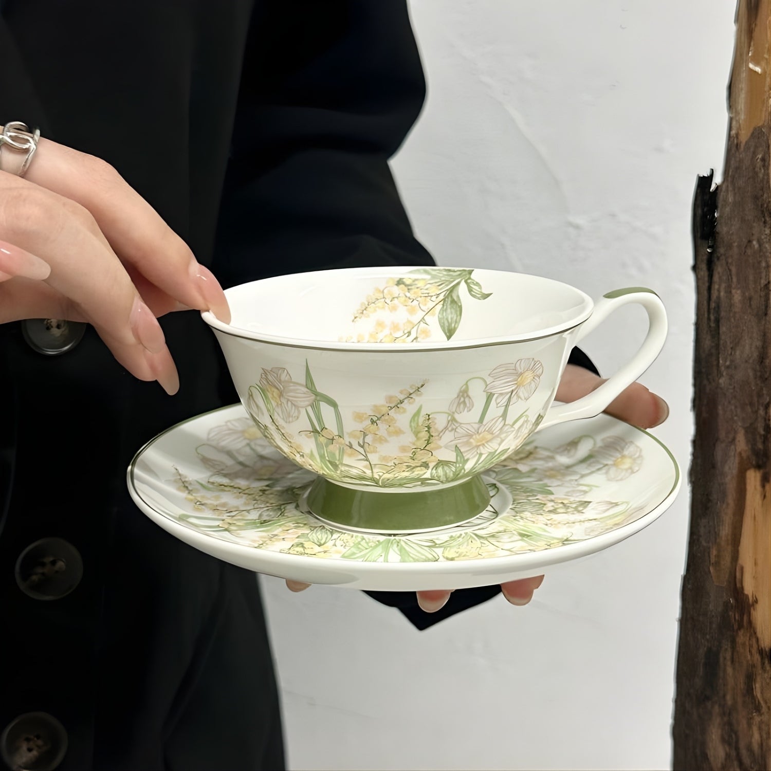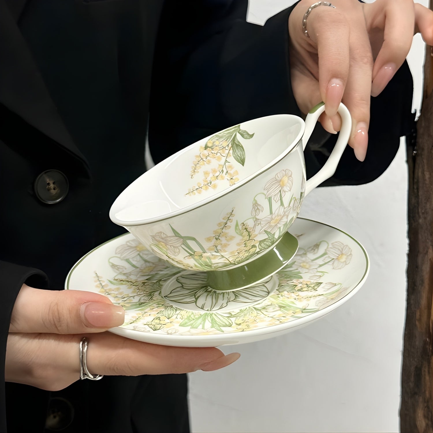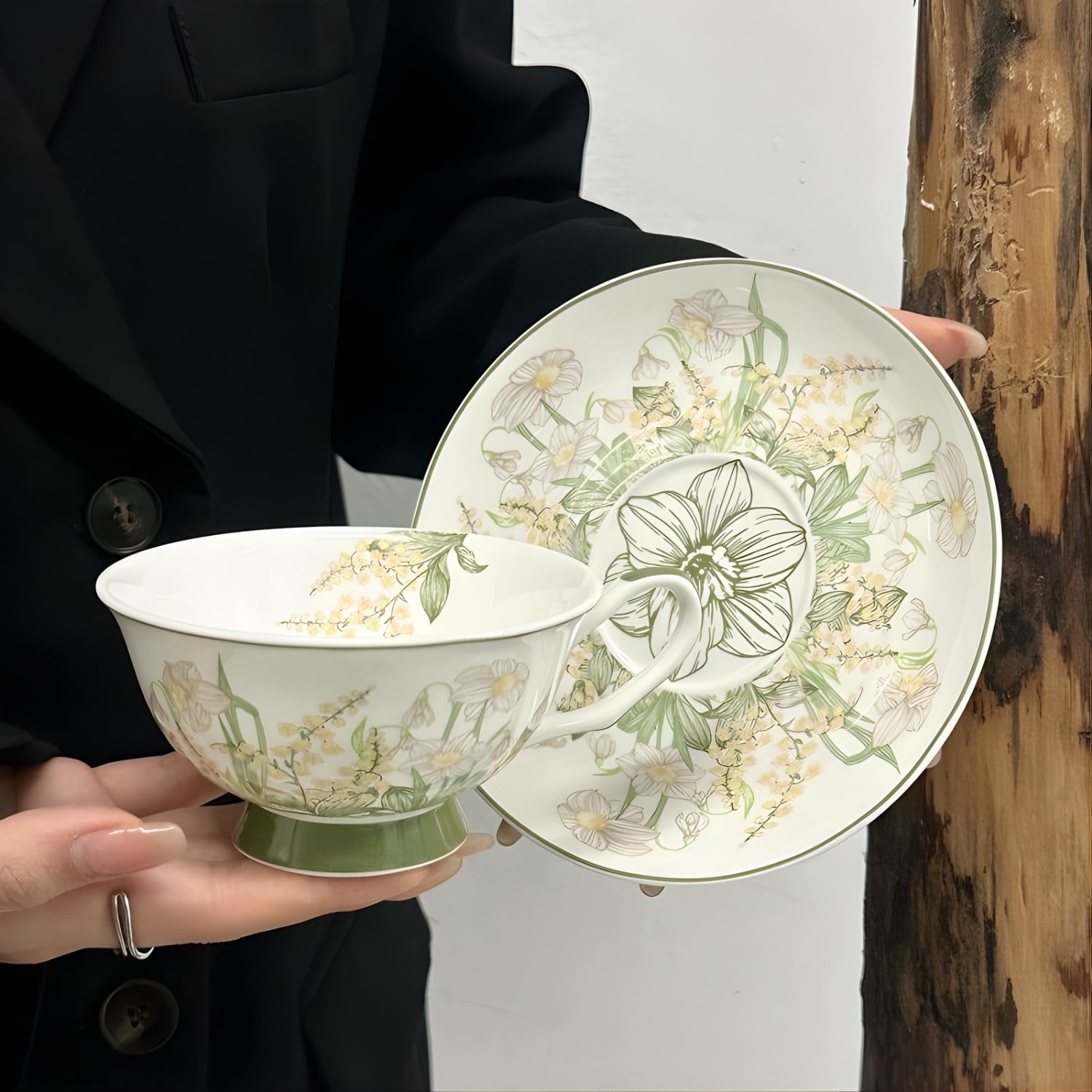 Adorned with delicate botanical illustrations and grounded by a soft green pedestal base, this porcelain set transforms tea service into an artful ritual.