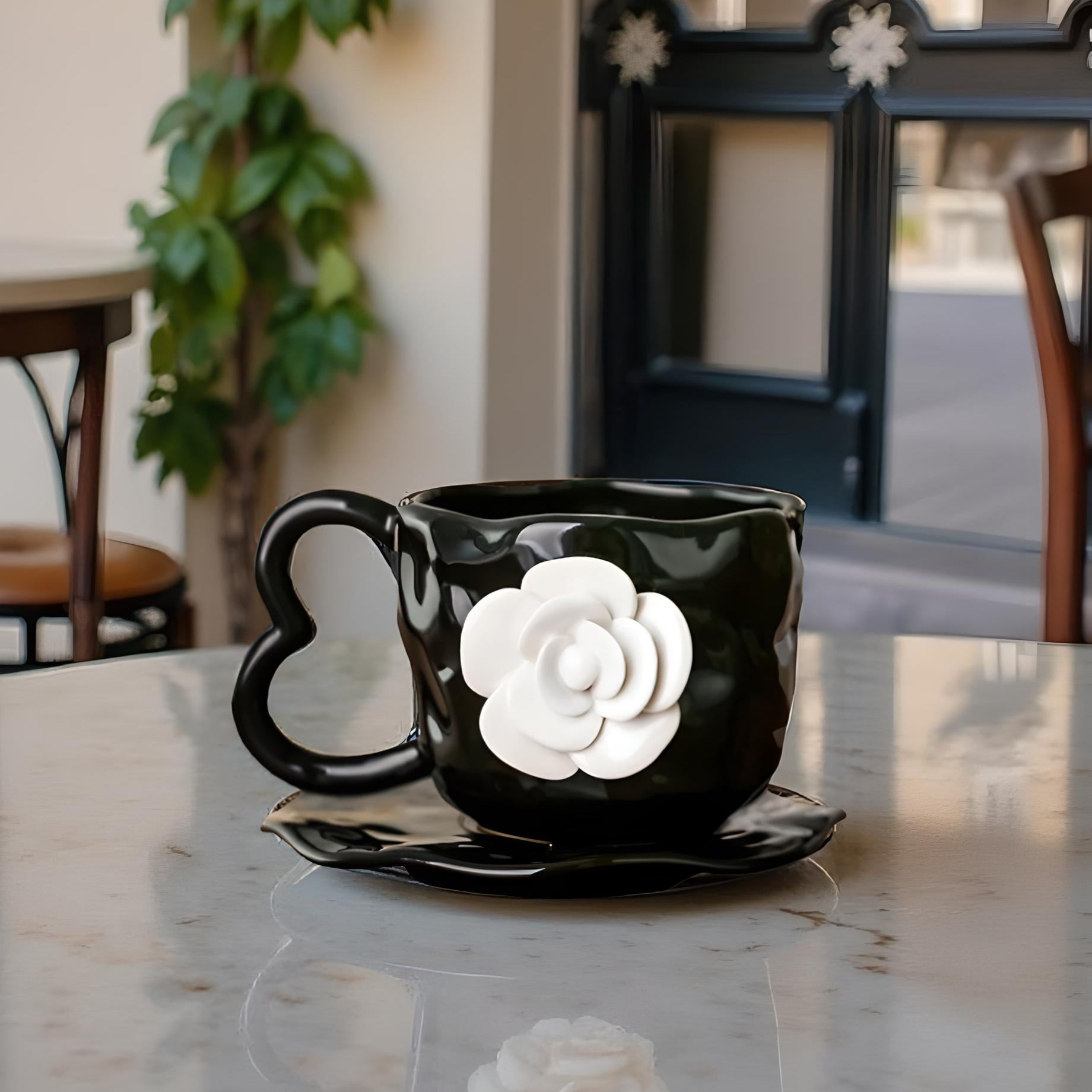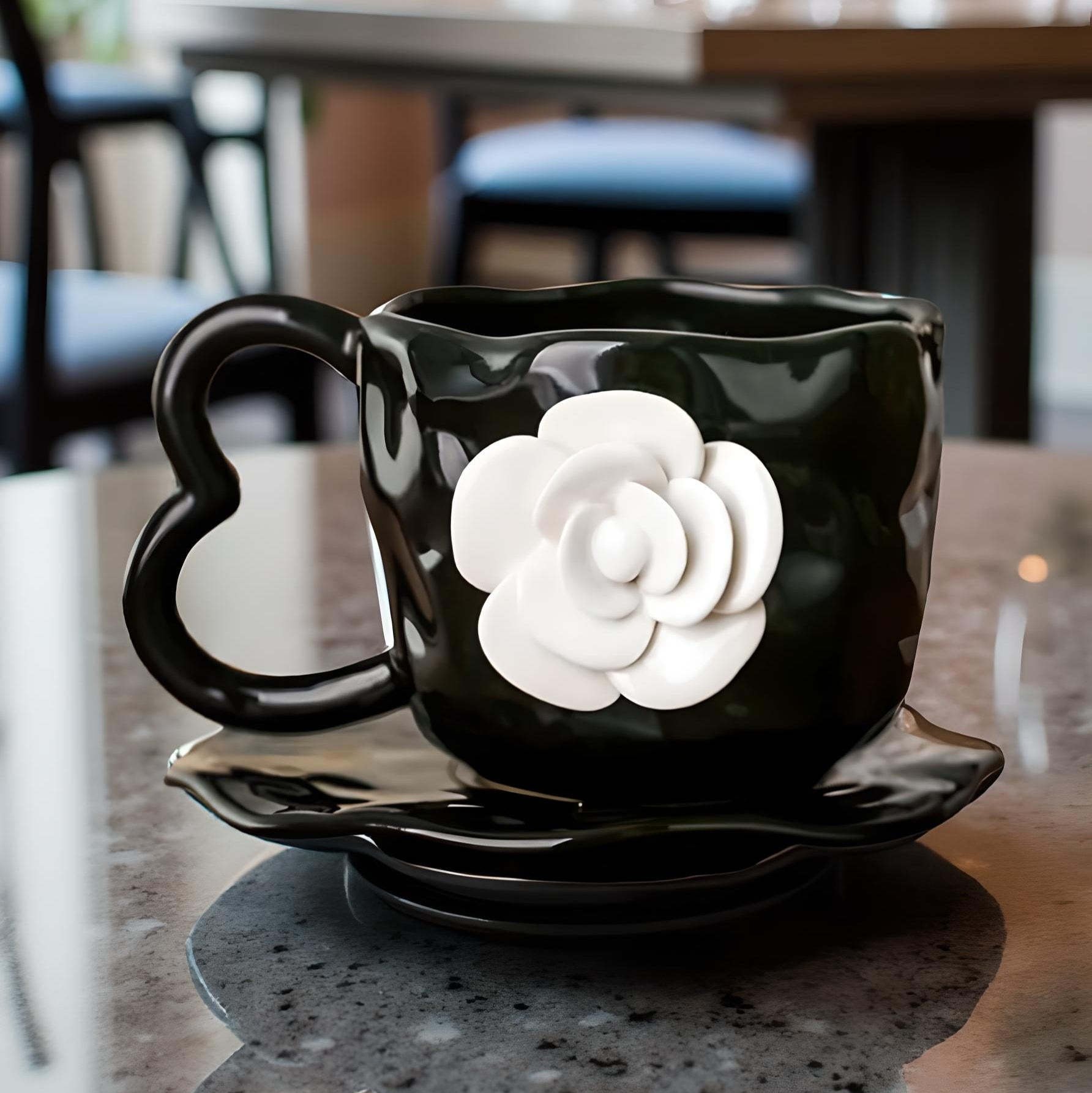 Elevate your coffee or tea ritual with this elegant two‑piece ceramic tea set, artfully crafted in glossy black and adorned with hand‑sculpted white rose accents. Each set features a charming heart‑shaped handle, merging romance and functionality in a timeless design.