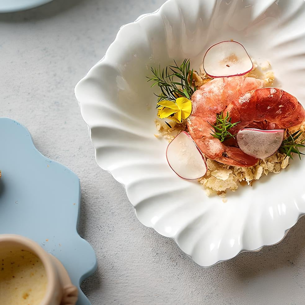 The white porcelain pieces echo oceanic shapes, offering a graceful, fluid silhouette perfect for refined plating.
