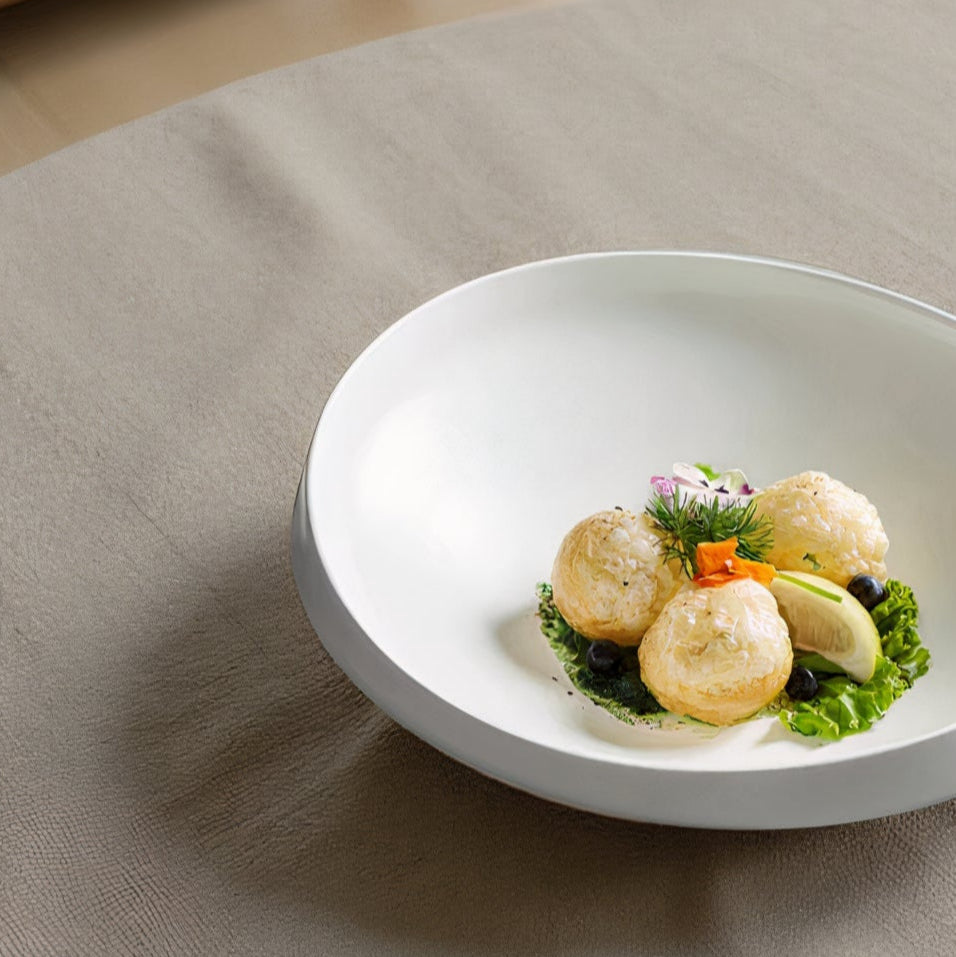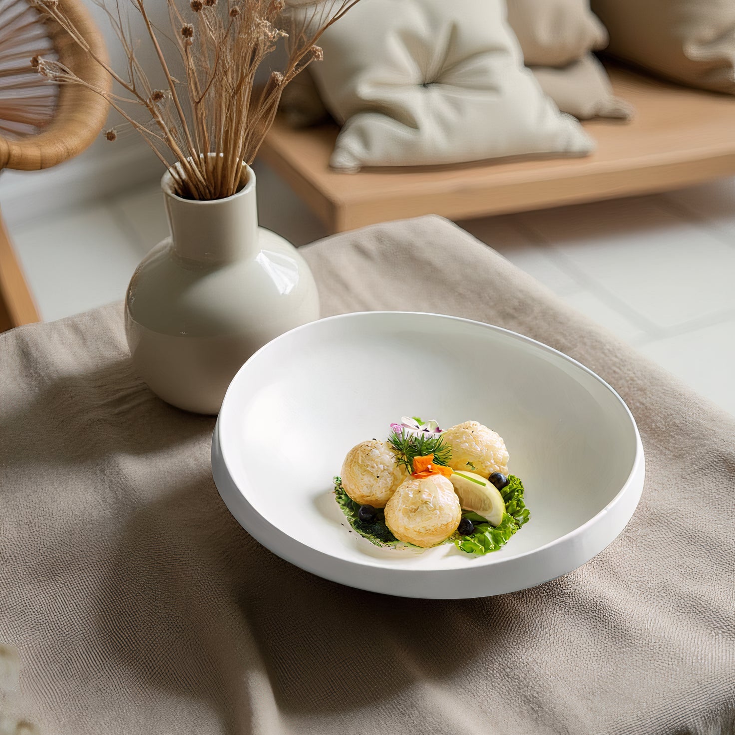 Minimalism meets elegance with this sleek matte white porcelain bowl, designed for the modern dining table. Its smooth, rounded silhouette and slightly elevated walls provide the perfect canvas for artistic food presentation.