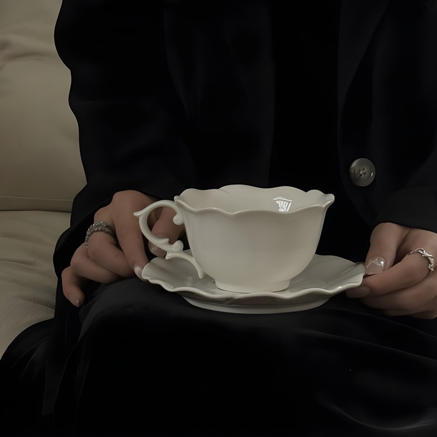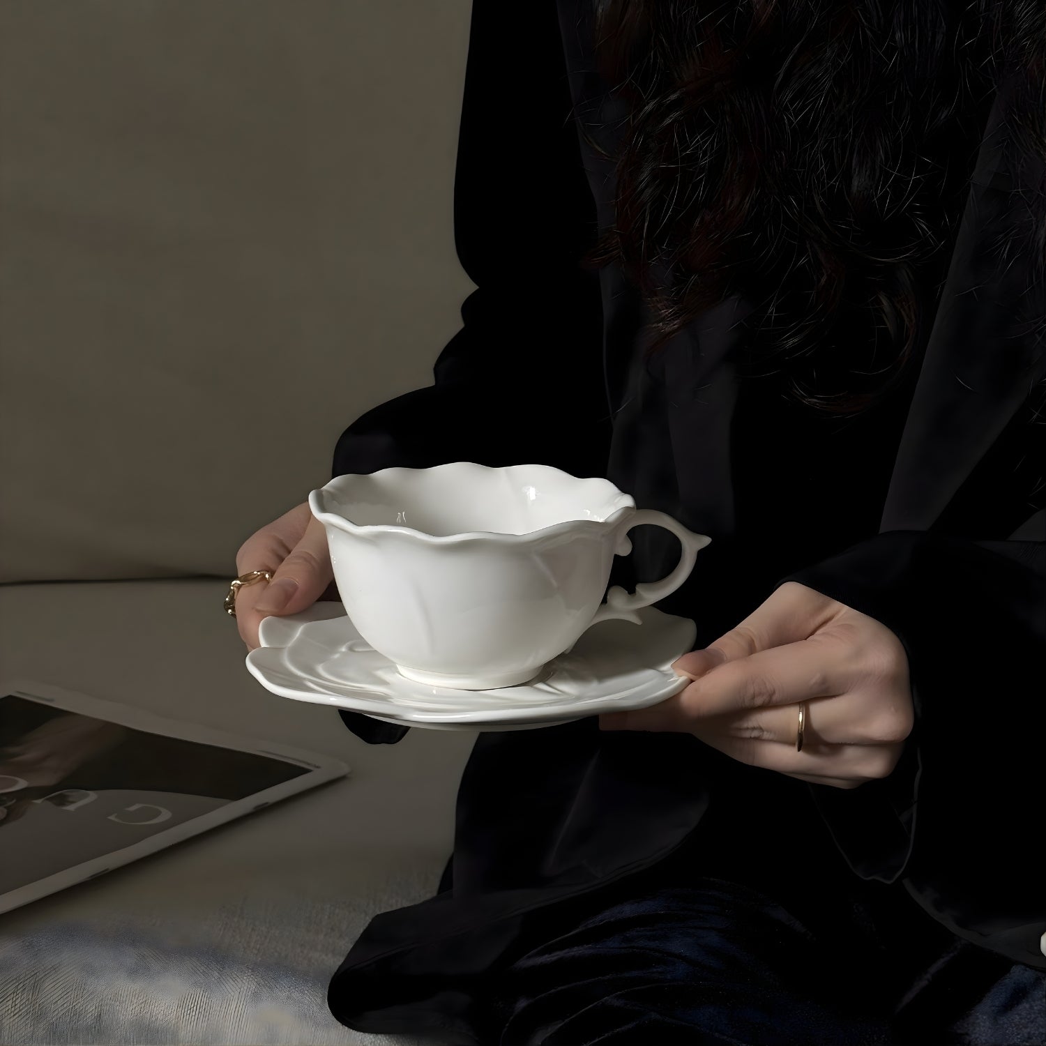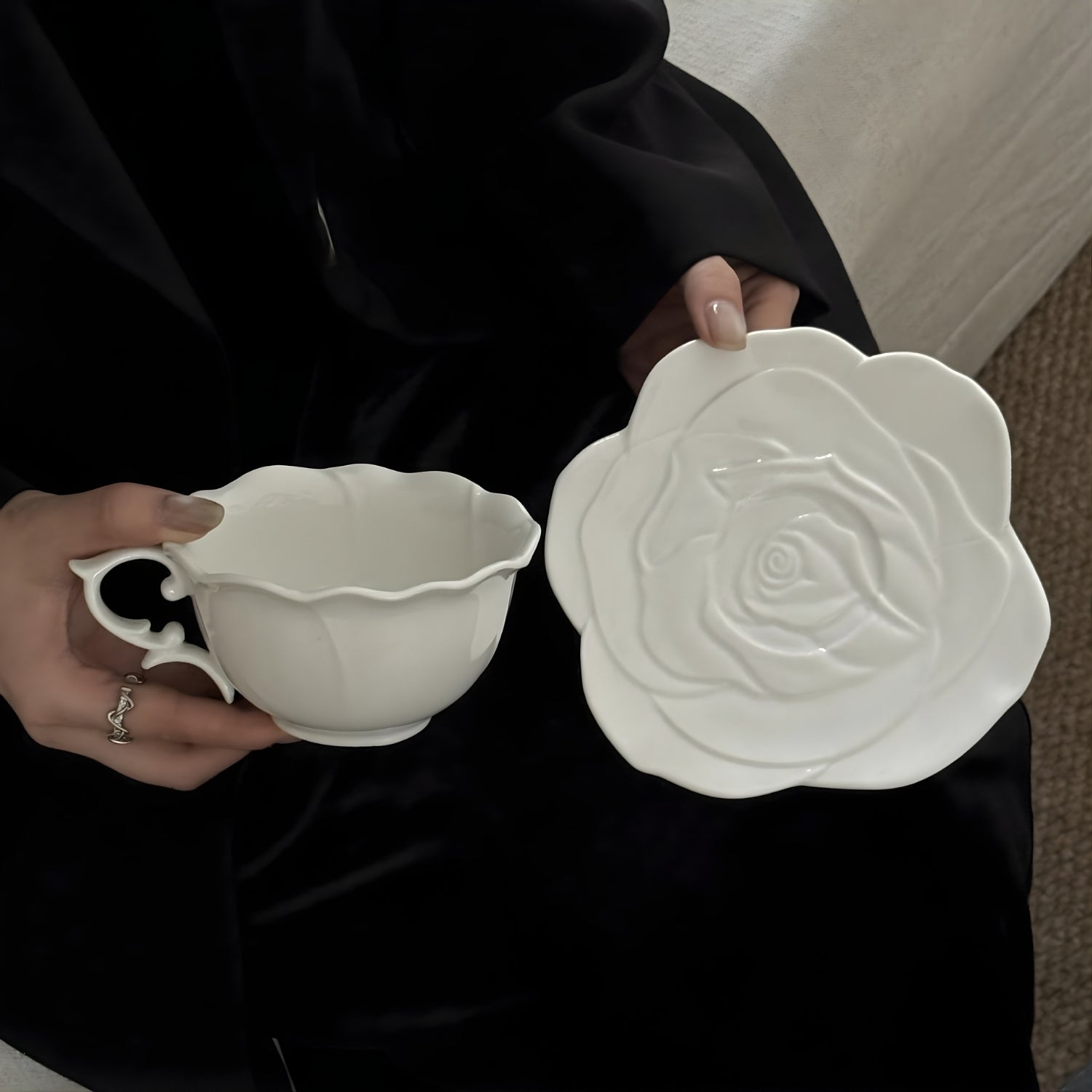 This sculpted ceramic tea set reimagines tea service as functional art. The saucer blooms in a dimensional rose relief — petals unfolding in subtle shadows — while the cup’s fluid silhouette rests effortlessly at its center.