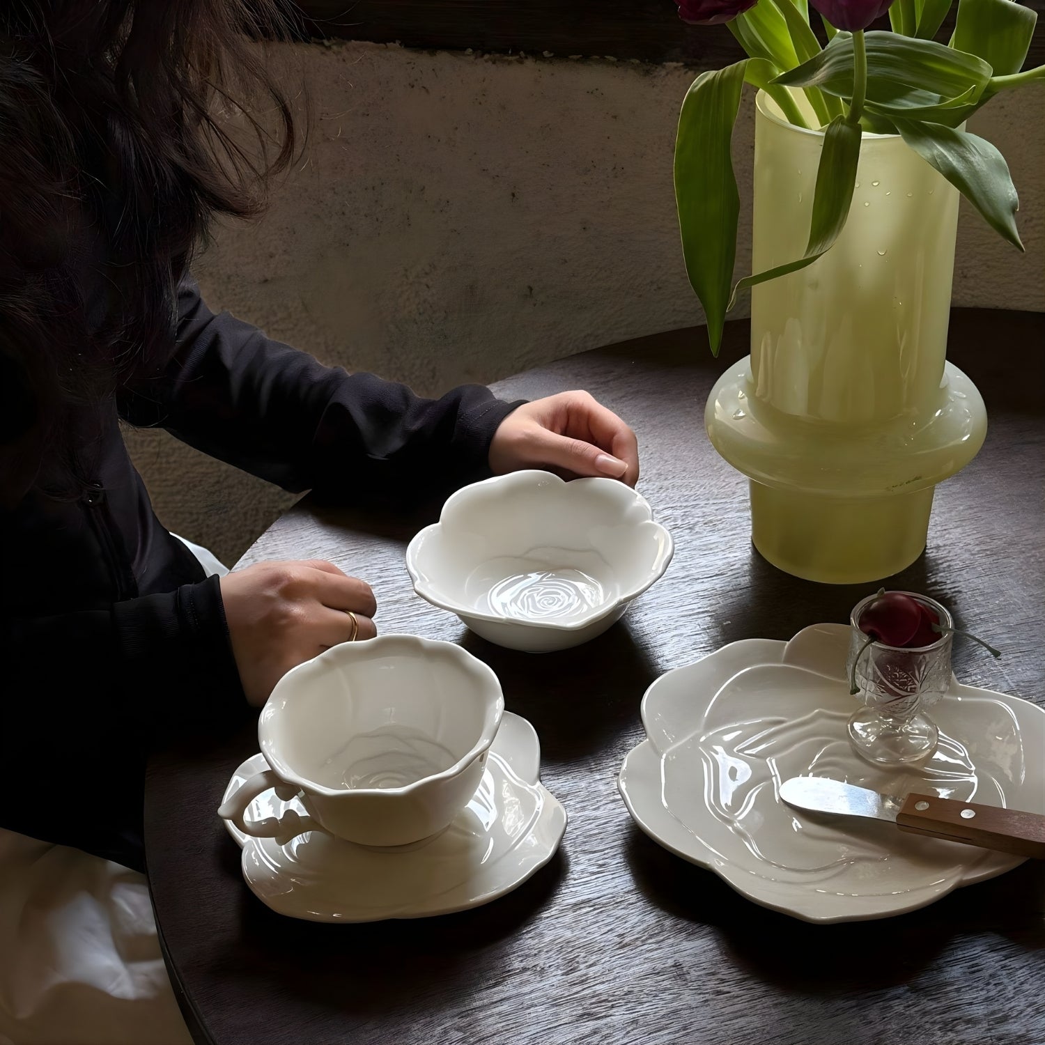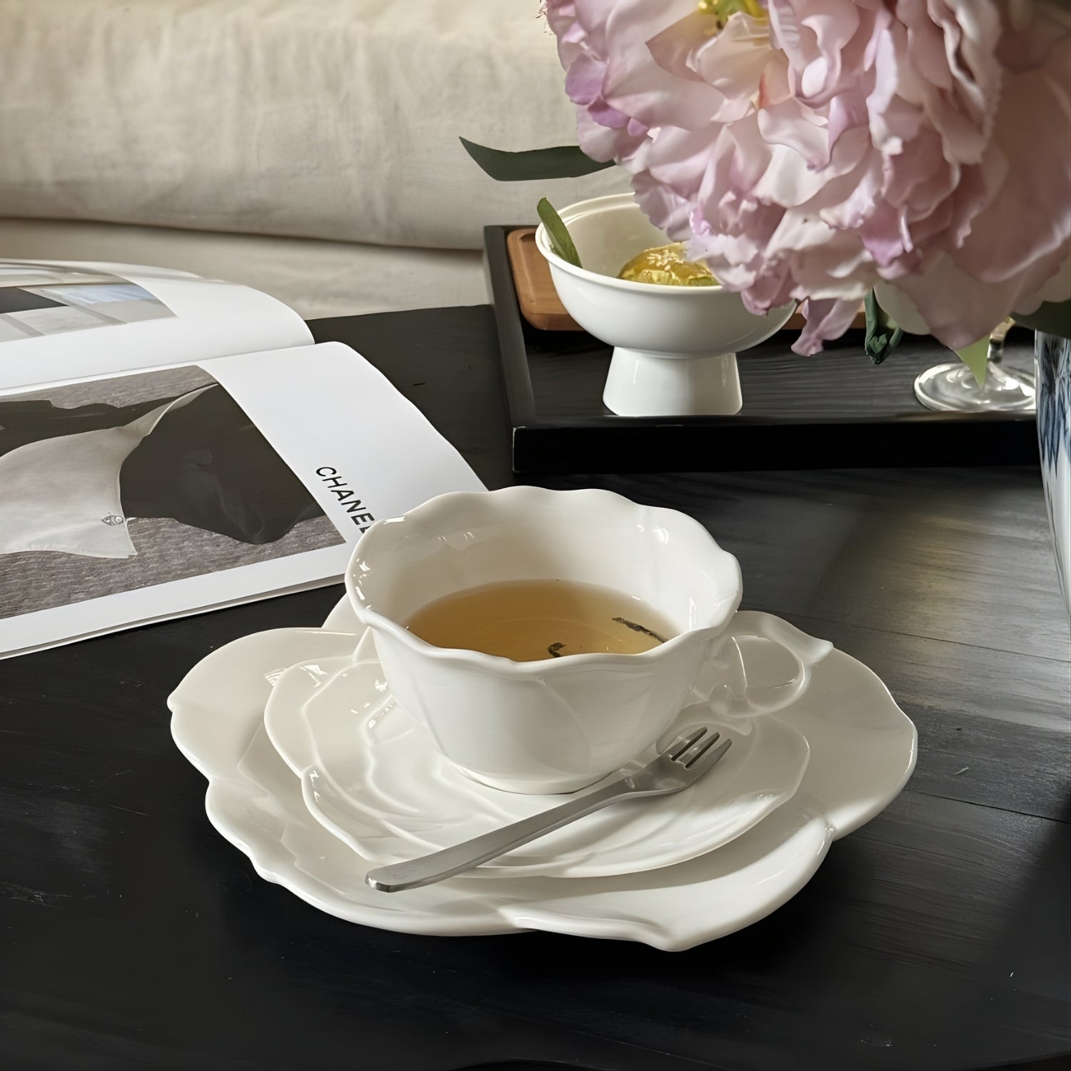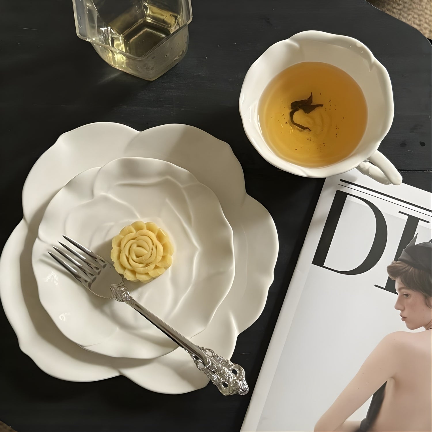This sculpted ceramic tea set reimagines tea service as functional art. The saucer blooms in a dimensional rose relief — petals unfolding in subtle shadows — while the cup’s fluid silhouette rests effortlessly at its center.