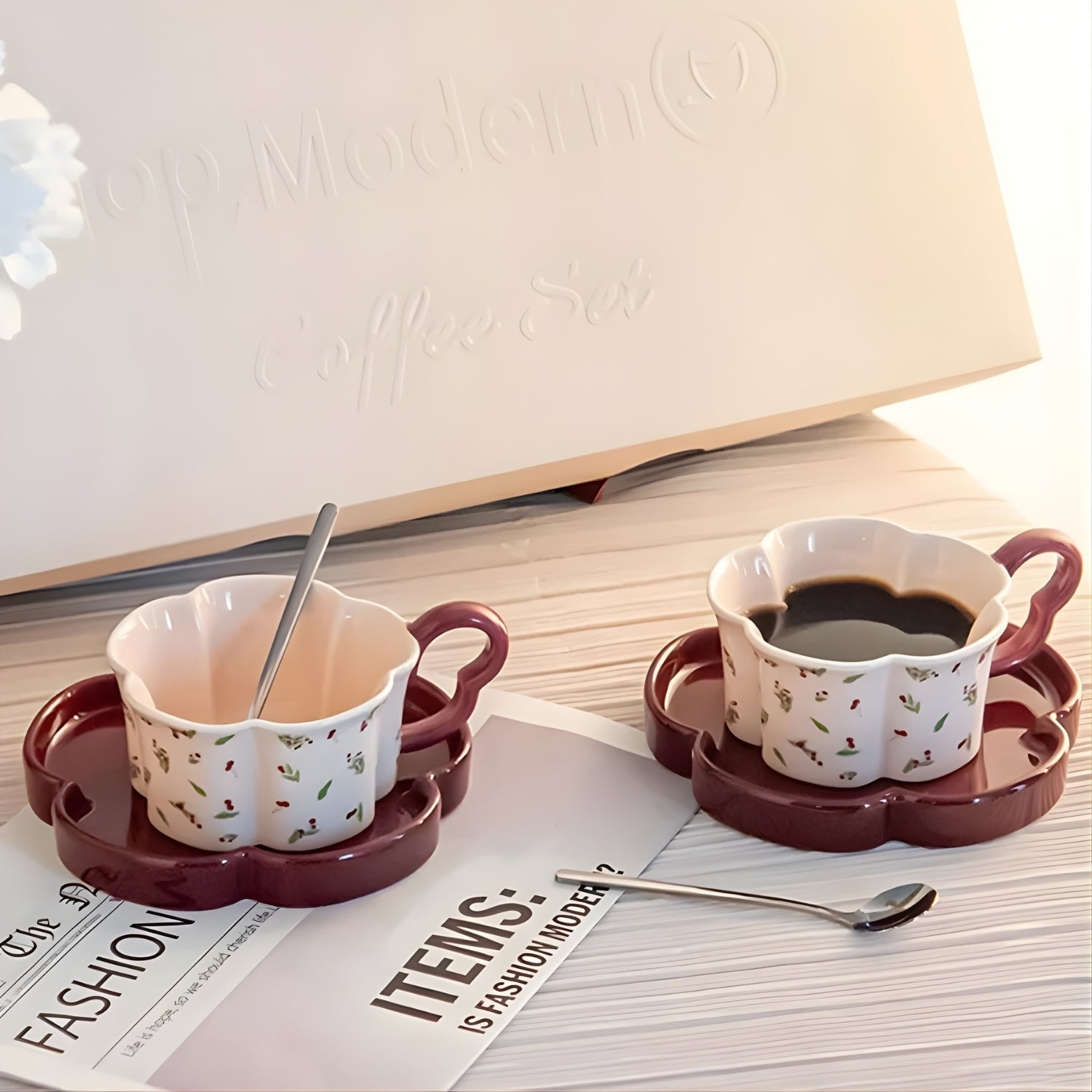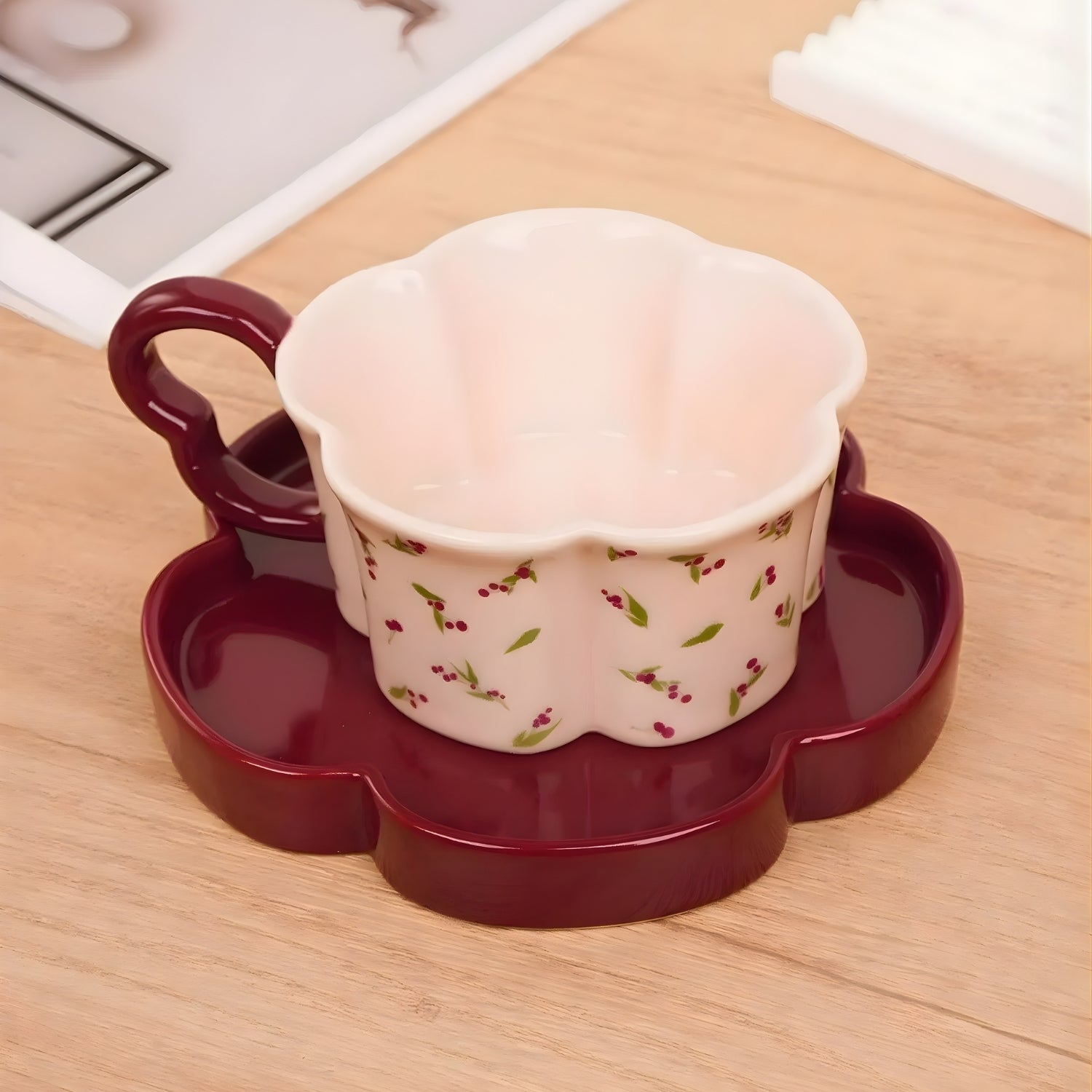 * 2 x Cherry Printed Cup with Maroon Saucer
