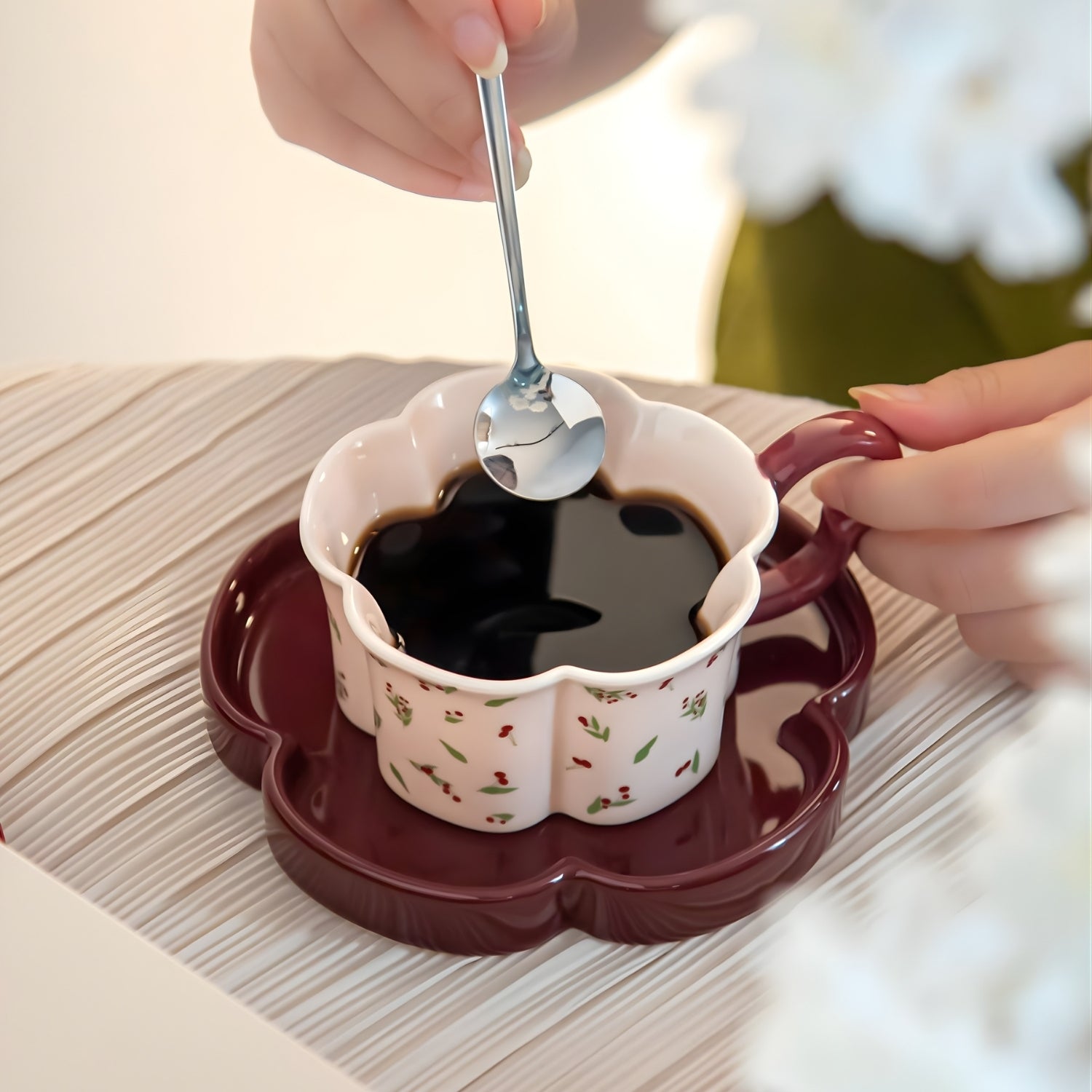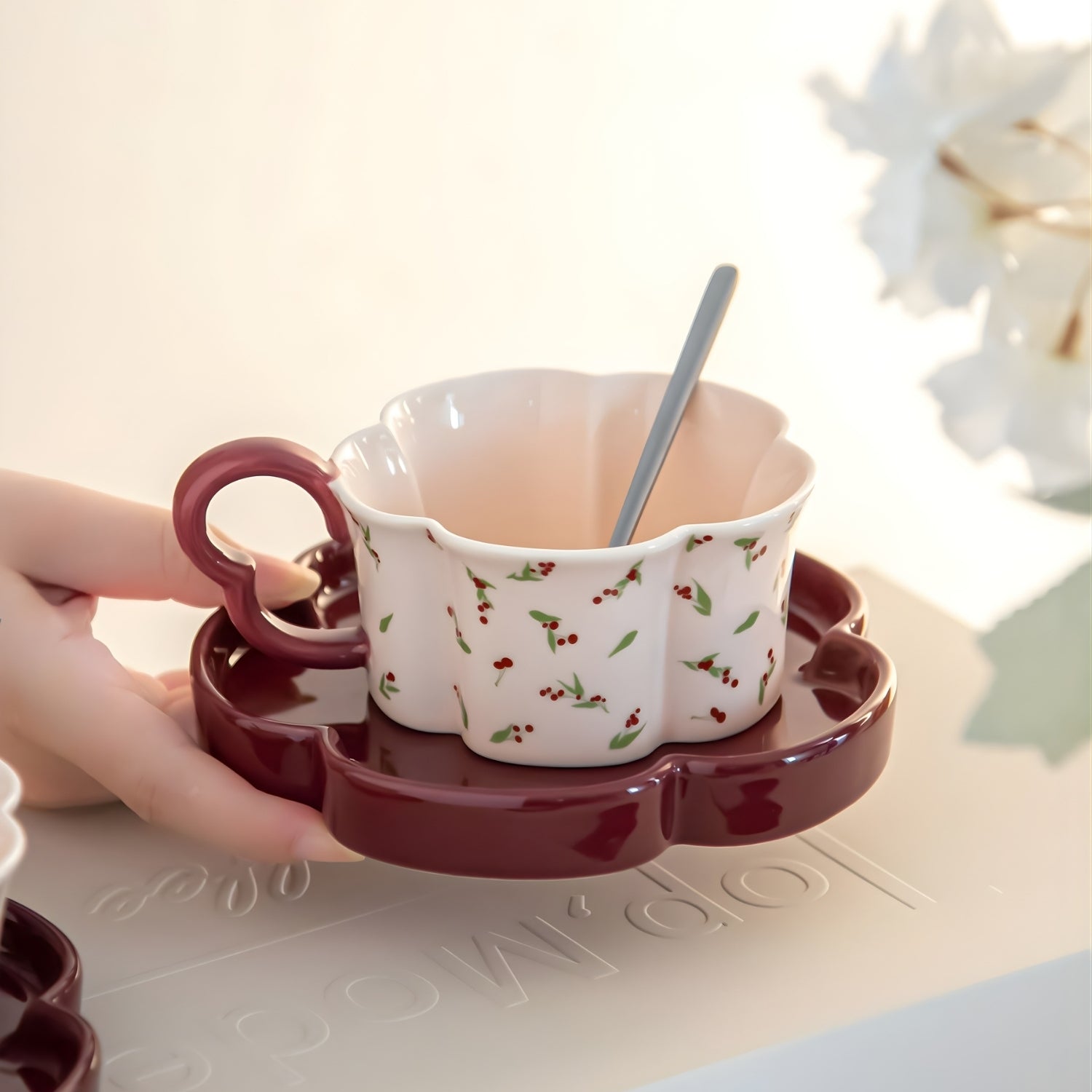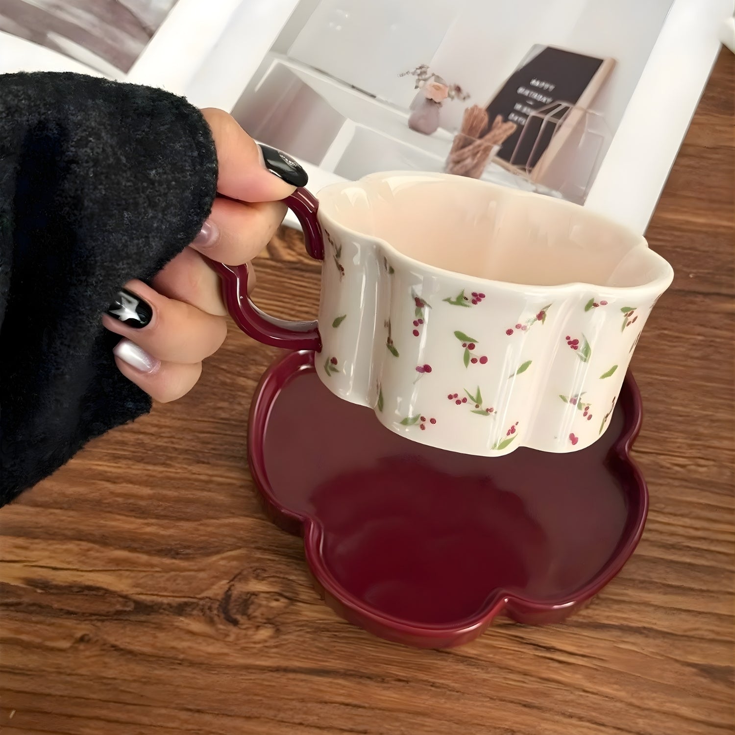 This sculpted tea cup and saucer set is an ode to intentional living. With its softly fluted cup, delicate cherry motif, and richly glazed sculptural saucer, it transforms tea service into a curated experience. The contrast between the warm blush interior, hand-finished detailing, and deep-toned base creates a visual harmony that feels both nostalgic and modern.